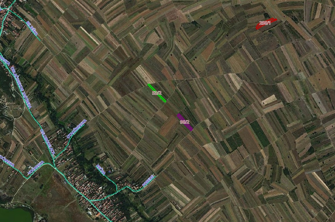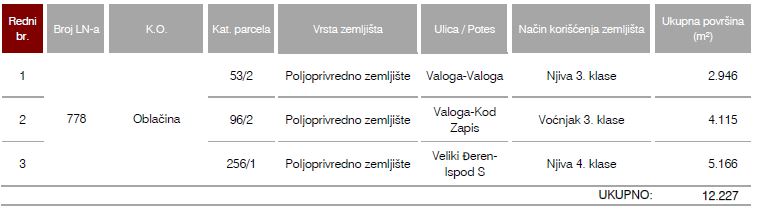 - Katastarska br. 256/1 KO Oblačina, površine 5.166 m2, poljoprivredno zemljište, njiva 4. klase;